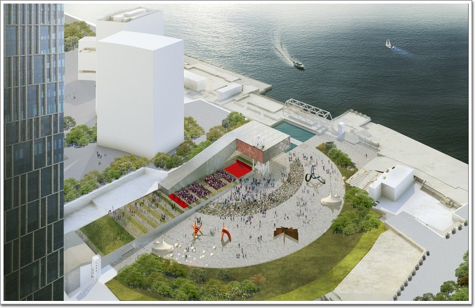 項目主要展覽空間懸挑于高8米的空中,使用者可于其中享受黃浦江的全景視野。同時OMA還在展覽空間下部營造了帶有頂蓋的開放空間。這是個看起來很小的項目,但卻混合室內(nèi)和室外空間,在一個緊湊的體量中融入了很多可能性。設(shè)計將展覽廳、階梯講堂、前廳以及步行坡道和屋頂平臺等不同功能容納于有限的建筑體量,在黃浦江沿岸打造了一個多功能空間。