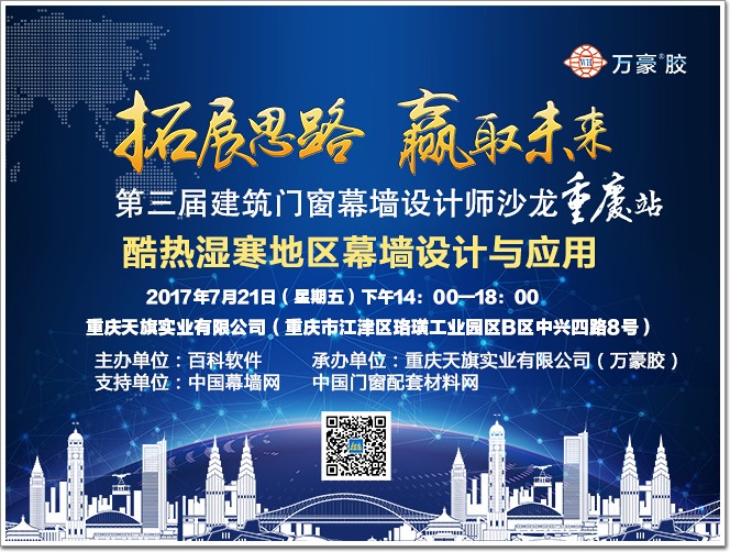 面對(duì)機(jī)遇與挑戰(zhàn),壓力與困難,該如何提升產(chǎn)品品質(zhì)、該如何樹立品牌形象,該如何拓展發(fā)展思路,找到適合自己企業(yè)發(fā)展的特色之路……這些都是我們當(dāng)下需要去逐一面對(duì)與解決的。為此由百科軟件主辦,重慶天旗實(shí)業(yè)有限公司承辦,中國幕墻網(wǎng)、中國門窗配套材料網(wǎng)特別支持,以“酷熱濕寒地區(qū)幕墻設(shè)計(jì)與應(yīng)用”為內(nèi)容,以“拓展思路,贏取未來”為主題的2017建筑門窗幕墻設(shè)計(jì)師沙龍(重慶站),將在2017年7月21日精彩開啟。
