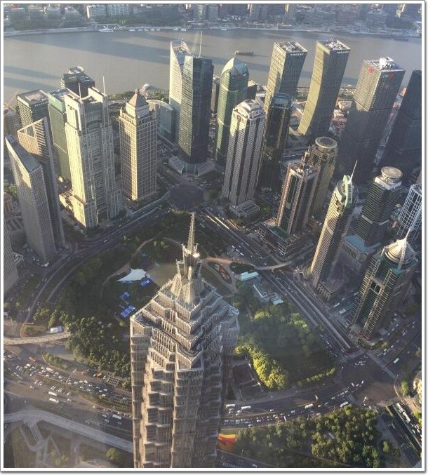 在上海中心大廈俯瞰金茂大廈和下邊的綠地。