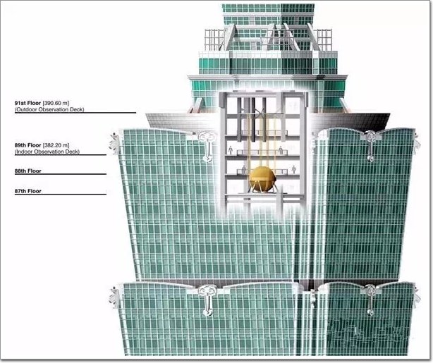 對于101這樣的摩天塔狀大樓來說,不需要地震,當風力達到足夠大時就足以對建筑物產生形變,使得居于其中的人感覺到“震感”。而大圓球被放置在樓頂,當外力作用于建筑物的時候,建筑物的擺動產生的能量會被傳導至大圓球,而大圓球的質量剛剛好可以在建筑物整體擺動時,由于慣性的作用向相反方向擺動,從而中和建筑物的形變。