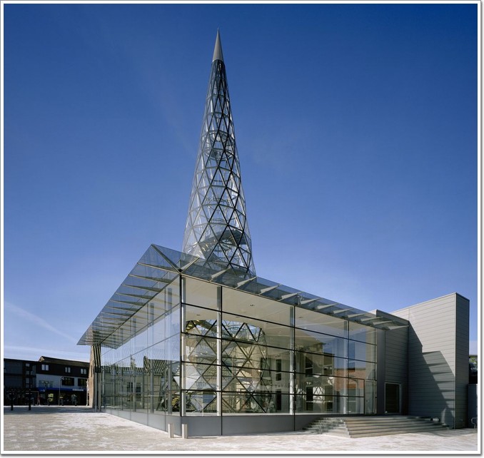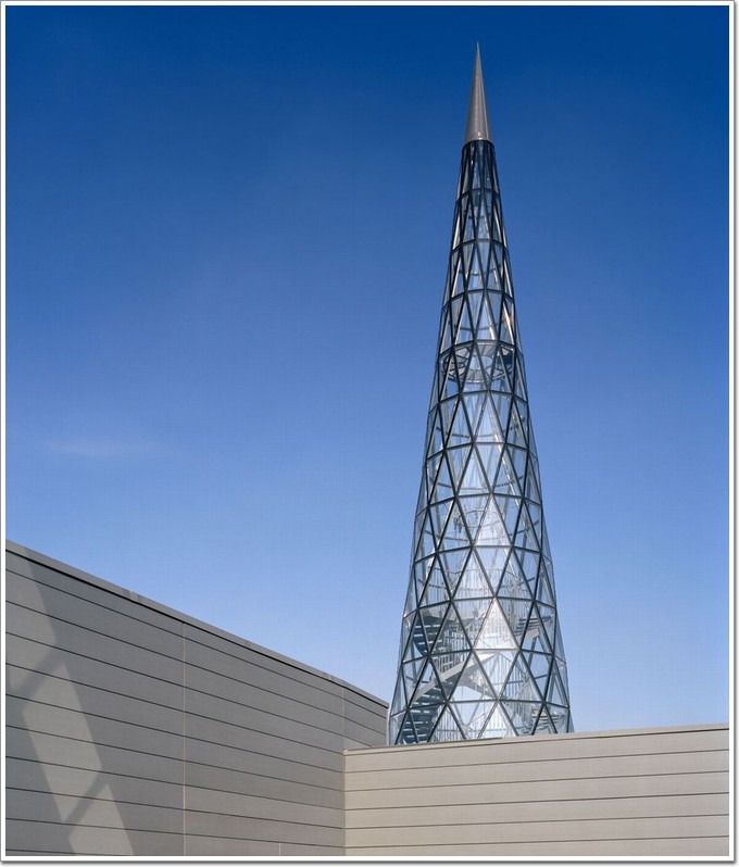 該項目是一座全玻璃建筑,直徑8米,總高度為30米,整體成圓錐形,項目利用現代設計手法令空間與其展示的藝術品無縫交融,形成一個統一的整體。玻璃中心由兩個相互聯系且相互作用的玻璃區構成,首先是由不銹鋼框架構成,用超透明玻璃幕墻覆蓋的平行六面體;其次,是三角形構架組成的玻璃圓錐體,也是玻璃中心的標志性建筑元素,被看作是第五個立面的屋頂,會在以后進行特殊的處理。該結構強調了玻璃中心的多功能性(教育、信息、服務、展覽和玻璃生產)。該建筑的結構正好適應了此多功能性,以各種創新的方式利用玻璃。