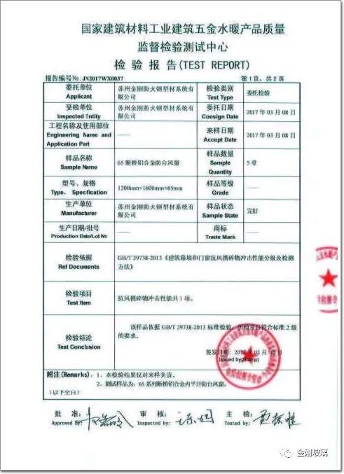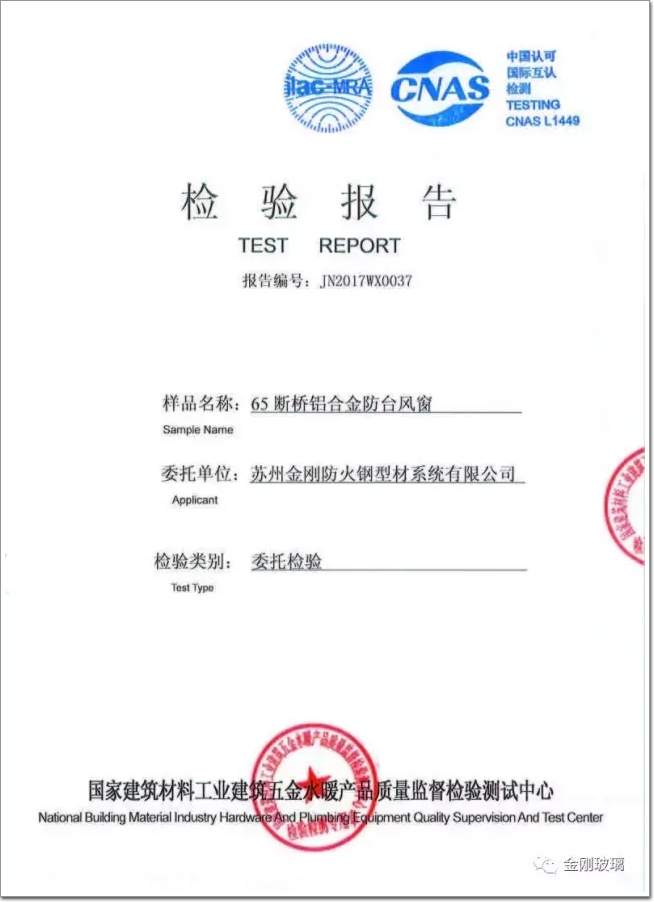 65斷橋鋁合金防臺風窗抗風攜碎物沖擊性能檢驗報告