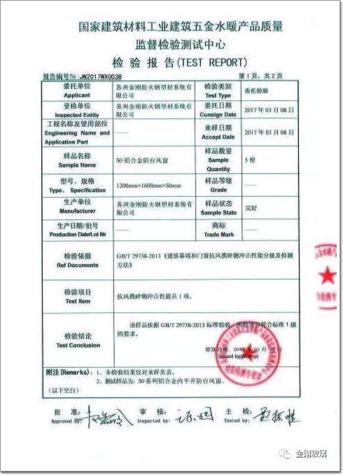 50鋁合金防臺風窗抗風攜碎物沖擊性能檢驗報告