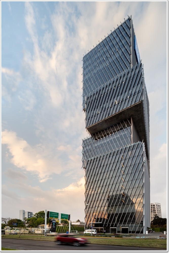 該項目于2017年落成,占地面積約5.8萬平方米,建筑規整的外貌由四個疊在一起的幾何形體組成,看上去像是由四個方盒子不規則的堆砌而成。這個概念源自于它本身混合功能性質的需求。從正面看,建筑中的兩個體塊與大體積錯位,而在反面,這四個體塊則連為一線。這個將讓不同體塊錯位的設計使得這棟建筑沒有一般高樓的厚實感,不穩定性是為了打破建筑呆板、穩固的外表,增加一抹優雅的運動感,同時還表達出一種優雅的美。整個建筑的底部空間是用作酒店客房,而在其之上的三個辦公用的體塊則由三個不同企業分別占據。