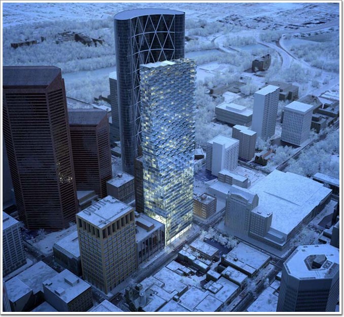 這個多用途的項目旨在促進卡爾加里經濟指數的增長,并且進一步使阿爾伯塔省建成一個主要的世界性的中心。這座建筑預計耗資4億美元,據悉,陽臺門窗的單價就高達2千美刀一平米。建筑的外形從底部往上逐漸凹陷,表面則是一個完全嵌合釉面模塊的結構,這就好像為該建筑鋪上一個動態、反光的“皮膚”,玻璃幕墻打造出“鉚釘”效果,無全脫離了普通玻璃幕墻大廈光滑平整的套路,遠遠看上去,整座大廈像鑲嵌了無數顆玻璃珠子,非常具有層次感。此外,內部設有一個5500平方英尺的藝術區,可以供住消遣。待天空塔完工,屆時將努力打造LEED白金級別的建筑,建成一個綠色環保的建筑,它的日常能耗預計比相同規模的建筑減少35%,只有普通建筑能耗的80%左右。