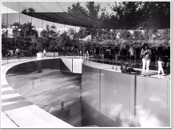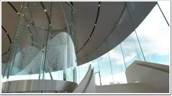 建筑是透明玻璃環繞起來的,玻璃不僅把屋頂頂起來,天花板上的噴淋裝置和燈,也都是通過玻璃平面(詞條“平面”由行業大百科提供)之間的縫隙來與電源做連接的,和蘋果一貫設計風格一樣簡潔自然,甚至有點黑科技的意味。