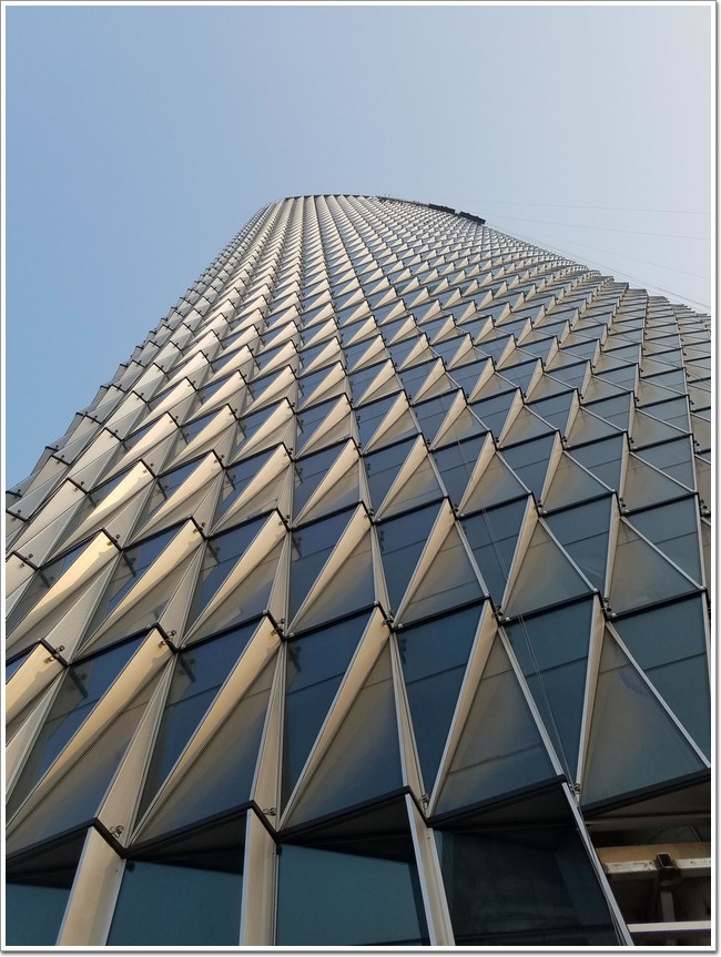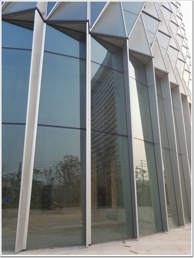 江北明發(fā)新城金融大廈A棟幕墻工程由江蘇合發(fā)傾力打造,建筑外皮大面采用了三角寶石形全透明的呼吸式節(jié)能玻璃幕墻,幕墻主要類型有單元式玻璃幕墻、構(gòu)件式玻璃幕墻、玻璃防雨百葉、鋼結(jié)構(gòu)玻璃雨篷等,其中建筑1層采用了大跨度鋼鋁框架玻璃幕墻,外帶傾斜上大下小的梯形線條,而寶石椎體雨篷用于建筑三個(gè)立面主入口處,三角寶石形單元玻璃板(詞條“玻璃板”由行業(yè)大百科提供)塊共3024塊,幕墻總面積約3萬平方米,造價(jià)達(dá)6千萬元。
