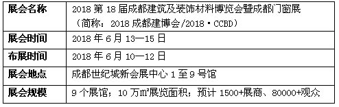 合資后首次舉辦的2018年第18屆成都建筑及裝飾材料博覽會(huì)將于2018年6月13至15日在成都世紀(jì)城新會(huì)展中心1至9號(hào)館召開,9個(gè)展館;10萬㎡展覽面積;預(yù)計(jì)1500+展商、80000+觀眾,展會(huì)同期將舉辦10+行業(yè)高峰論壇。