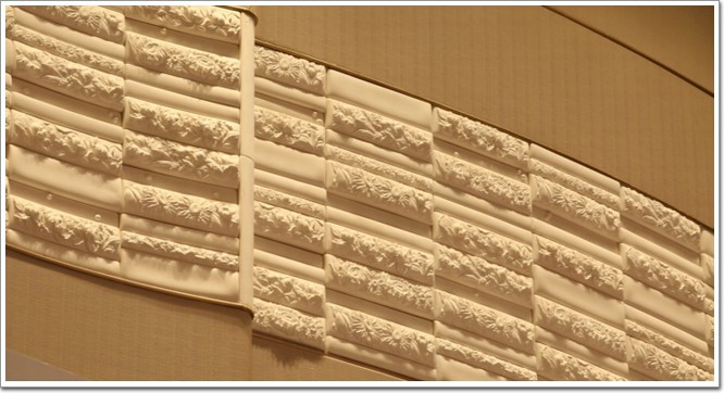 此外,在內裝方面,則由亞廈裝飾傾力打造。在場館的裝修當中,為了追求最完美的視覺效果,裝飾團隊從材料種類、顏色搭配、肌理效果到紋路方向,都進行了精細調整,并充分利用了環保再循環的材料,金磚會晤以后場館里面的有一些設施可以進行拆卸回收使用。值得一提的是,五國大范圍會議室的主背景墻上,宋代名窯之一的德化瓷被做成了金磚五國國花的造型“貼”在了墻上,“把宋代名瓷當‘瓷磚’,由于是第一次,項目部尤其謹慎,派專人到德化瓷生產地,考察當地土質,考察廠家工藝,還要嚴格規定德化瓷采土的位置、深度,不容絲毫馬虎。