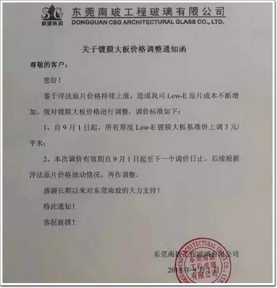 而同樣作為門窗幕墻主材之一的玻璃,隨著國內原材料人工環境治理等綜合因素的影響,5月份以來,主原料純堿價格持續上漲,至本月底重堿主流價格已漲至1840元/噸,累計漲幅240元/噸。與去年同期比,2016年8月中旬,純堿價格1380元/噸左右。無論是從短期還是中長期成本對比來看,玻璃企業原料成本提升48-80元/噸不等。國內各大玻璃廠家近期對玻璃產品都進行了局部價格調整并以文件形式發布市場,玻璃價格上漲已經在發生。