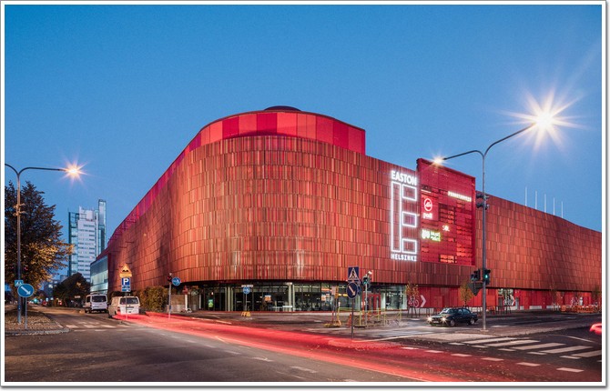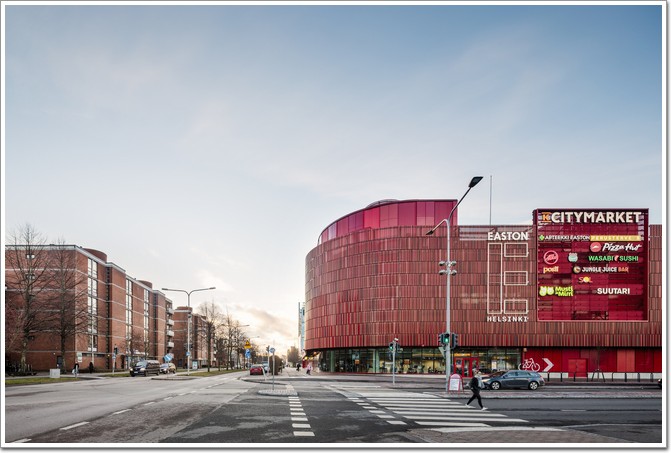作為商業建筑,外部的造型和色彩的運用很大程度上起著吸引消費者前來消費的作用,它們的建造方式往往打破常規,不走尋常路,正如芬蘭最大的商業綜合體——赫爾辛基Easton商業中心,它以鮮艷的紅色馬塞克立面征服這座城市,成為當之無愧的紅色城市地標。