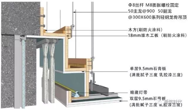 3、18mm細木工板刷防火涂料三度,與吸頂吊件采用35mm自攻螺絲固定