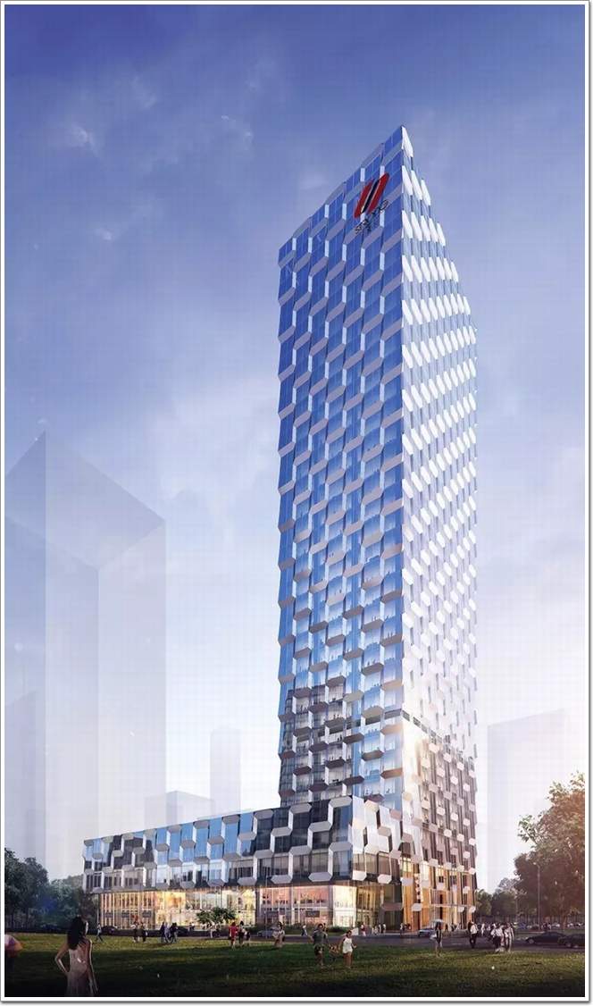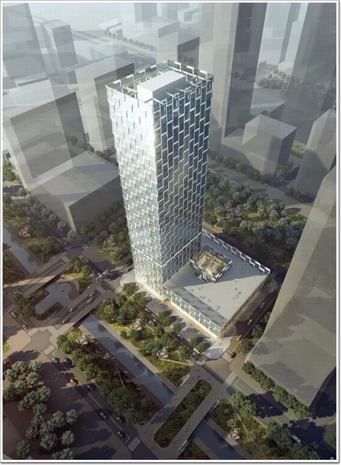 在塔樓西側設置廣場,城市景觀由廣場延伸至辦公大堂,增強主入口的領域感。為了避免塔樓過于纖細,設計將標準層投影面積擴大,再以辦公中庭、空中花園填充塔樓,使塔樓在總面積不變的情況下獲得更多的綠化和交往空間。