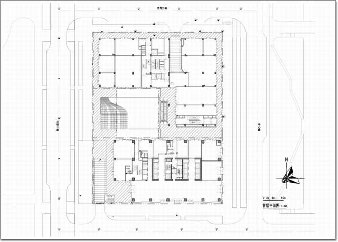 首層大堂與地下室之間設置專用電梯,以提高地上塔樓電梯的運行效率,高、中、低區辦公人員在一層進行分流。首層大堂采用三層通高,氣勢恢宏、邊界通透,實現了景觀在空間上的滲透。辦公層采用合理進深,采光通風良好,平面方整,實用高效。