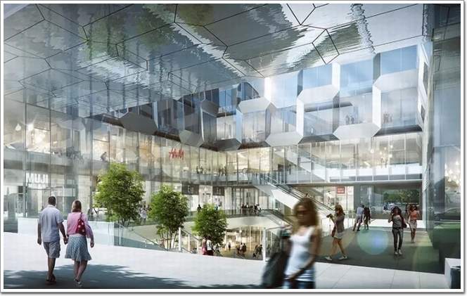 中部設置東西向公共步行通廊,-1層至3層圍繞下沉廣場和東西通廊組織,通過垂直交通串聯商業空間。