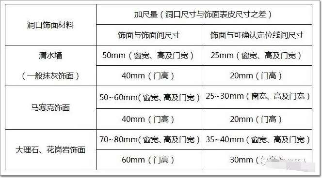 下表是幾種常見飾面材料的門窗加尺量,后面所述的常規加尺均按此進行。