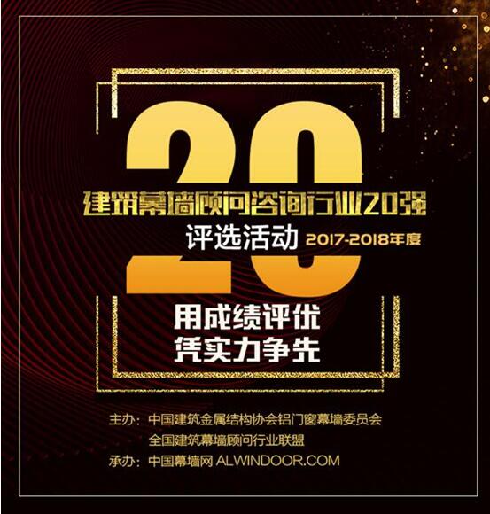 為了更好的推廣建筑幕墻顧問咨詢行業企業,幫助上游房地產商及設計院更好的了解建筑幕墻顧問咨詢行業品牌,中國建筑金屬結構協會鋁門窗幕墻委員會與全國建筑幕墻顧問咨詢聯盟聯合發起,共同主辦“2017-2018年度首屆建筑幕墻顧問咨詢行業二十強”評選活動(簡稱“TOP20”),并委托由中國幕墻網ALwindoor.com獨家承辦。