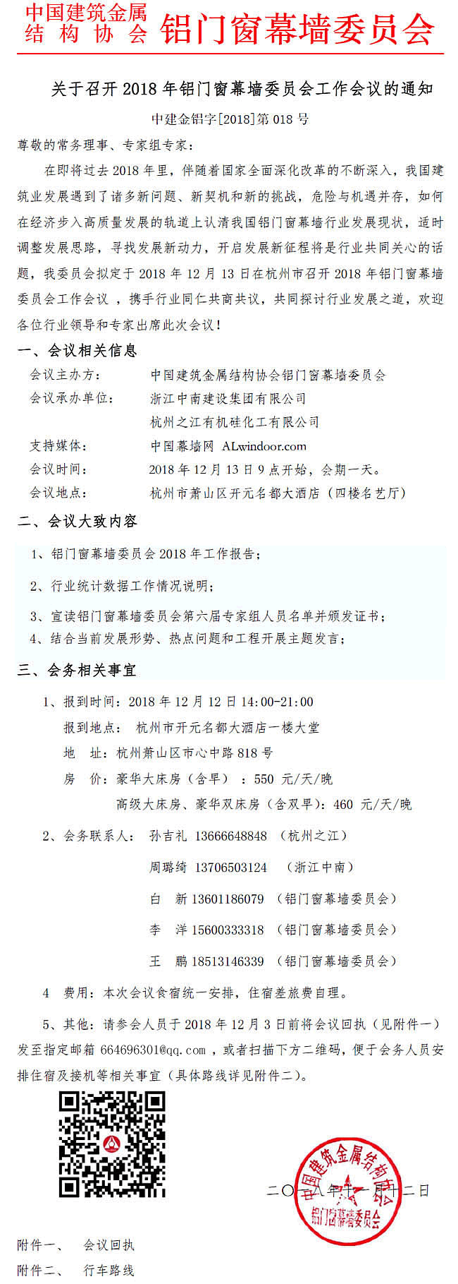在即將過去2018年里,伴隨著國家全面深化改革的不斷深入,我國建筑業發展遇到了諸多新問題、新契機和新的挑戰,危險與機遇并存,如何在經濟步入高質量發展的軌道上認清我國鋁門窗幕墻行業發展現狀,適時調整發展思路,尋找發展新動力,開啟發展新征程將是行業共同關心的話題,我委員會擬定于2018年12月13日在杭州市召開2018年鋁門窗幕墻委員會工作會議,攜手行業同仁共商共議,共同探討行業發展之道,歡迎各位行業領導和專家出席此次會議!