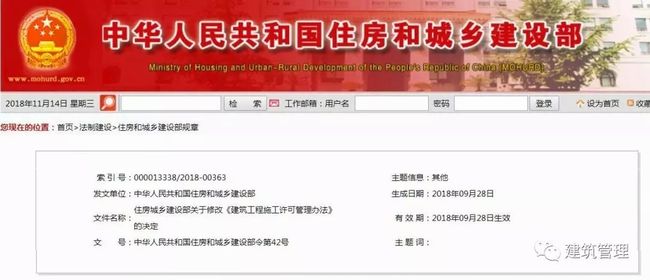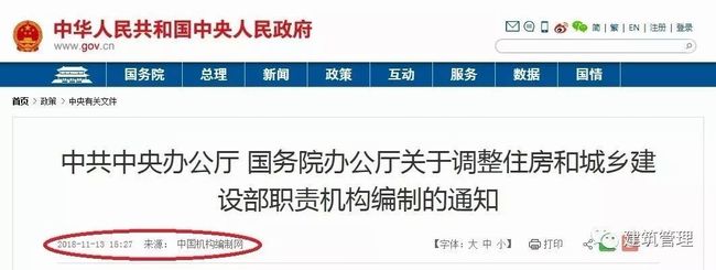 2018年11月13日,中央人民政府官網(wǎng)正式刊登發(fā)布了《中共中央辦公廳 國務(wù)院辦公廳關(guān)于調(diào)整住房和城鄉(xiāng)建設(shè)部職責(zé)機(jī)構(gòu)編制的通知》。
