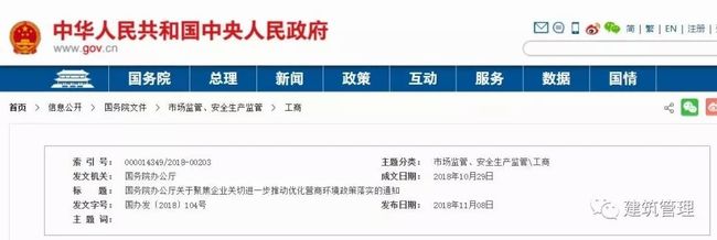 2018年11月08日國務(wù)院辦公廳下發(fā)《國務(wù)院辦公廳關(guān)于聚焦企業(yè)關(guān)切進(jìn)一步推動優(yōu)化營商環(huán)境政策落實(shí)的通知》(國辦發(fā)(2018)104號),通知明確提出:進(jìn)一步簡化企業(yè)投資審批。