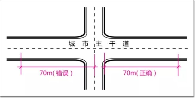 (城市主干道上不宜設置聚集人氣的出入口,包括規劃設計也是一樣的。主干道上可以開設輔助入口,車行出入口要求遠離主干道交叉口70米。如果基地上只有一條路,而且是主干道的話,沒有辦法,只能開在這個方向,那么需要退出足夠的距離設置一個面積很大的疏散廣場,不過一般情況下不會出現這種情況)
