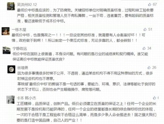 2017年5月31日,《人民日?qǐng)?bào)》發(fā)文《質(zhì)量應(yīng)是企業(yè)立身之本(一線視角)》,首次詬病最低價(jià)中標(biāo)。