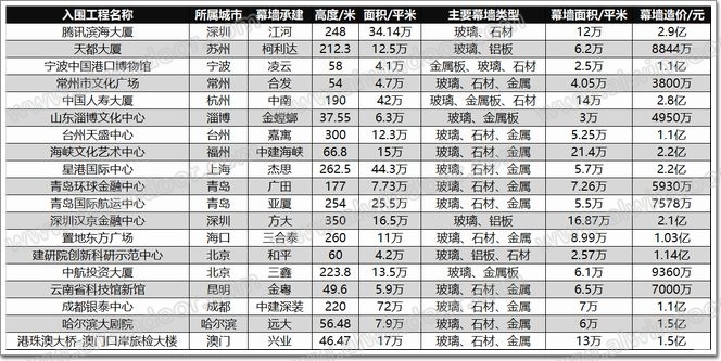 通過下面這張工程信息表我們可以發現,本年度入圍的幕墻工程項目,所選用的建筑型材、玻璃、五金、建筑膠、隔熱條、密封膠條等,均為中國門窗幕墻行業“首選品牌”上榜產品,品牌度高、質量上成的材料供應商,得到廣大業主、設計院以及工程企業大型工程或地標項目中高度的認可,令人欣喜。
