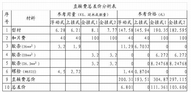 1.本表僅考慮每平米直接費的差價,且未計插芯、托板、角片和翻窗(詞條“窗”由行業(yè)大百科提供)費用。