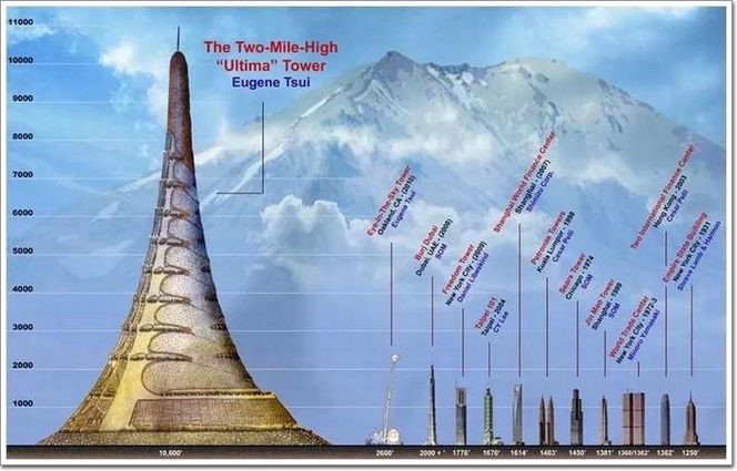 Ultima Tower是由加州建筑師Eugene Tssui提出的超高層建筑項目,地基直徑1.8公里,高3200m,不禁讓人聯想到巴別塔。