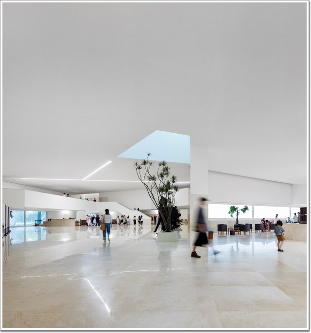 博物館入口處層高2米多,而大堂中央的高度有7米,走進大廳,視野開闊。頂部用了玻璃采光頂,明媚的陽光傾泄而下,正如設計師所要求的,建筑要有光,但沒有燈;簡潔、純粹而又充滿方形和三角形的幾何變化,巧妙地通過巨型玻璃窗將外部空間的景色引入展廳之中,使充滿張力的空間增強了趣味。在合理規劃固定展覽和臨時展覽空間的同時,將室內空間延伸到建筑的外部,構建出一個個獨立圍合的空中庭院,使得博物館的空間變化豐富無比。