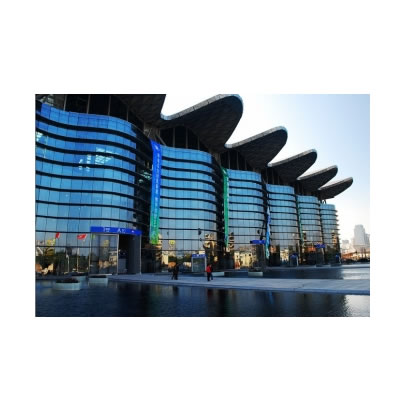 建筑外立面工程由蘇州金螳螂幕墻有限公司打造,主要采用玻璃幕墻,其主要幕墻形式為占式玻璃幕墻,雙層透明玻璃夾一層金屬打孔板,整體玻璃幕墻采用透明到不透明的漸變模式,玻璃中間金屬網的透光率(詞條“透光率”由行業大百科提供)也不心相同,上方的玻璃相對于下方的透光少。建筑風格以曲線主為,曲面雙層玻璃幕墻連接屋頂與基座,采用由垂直構件制成的輕質格架座位立面的主要結構,具有較強的抵抗風荷載和抗震能力。