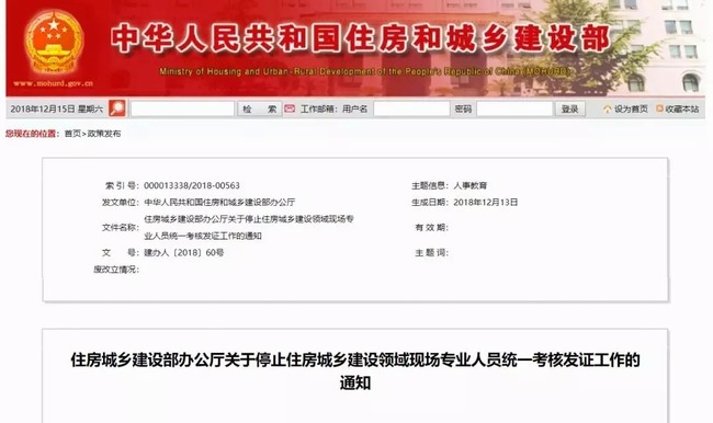 2018年12月14日住建部官網發布《住房城鄉建設部辦公廳關于停止住房城鄉建設領域現場專業人員統一考核發證工作的通知》,通知明確提出: