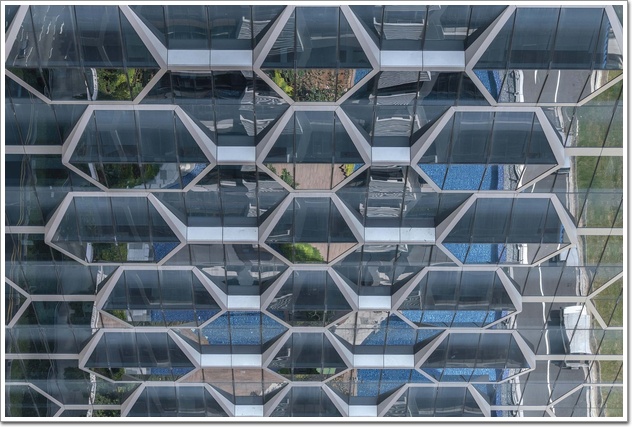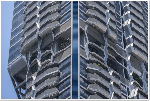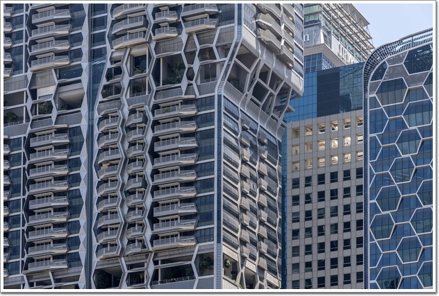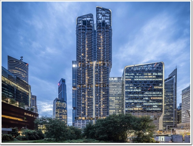最豐富多樣的三個空中花園覆蓋了大樓整個8樓的空間。在住宅大樓中心的兩個空中大廳,居民可以享受更大的隱私,同時欣賞24樓和34樓的城市景觀或海景。頂層公寓的居民還可以專享53樓和54樓的戶外屋頂平臺。建筑一樓的地板鑲嵌不銹鋼線條,天花的光線強調公共區域,而汽車坡道則以垂直薄片覆蓋,便于指引行人到達不同目的地。地面大堂旁邊的大型咖啡廳形成了公共區域的中央交匯點。辦公與住宅塔樓不單形態相同,外立面的圖案也是從同一組圖樣衍生出來的。圖樣基本以六角形組成,利用其角度、遮亮度應對新加坡的熱帶氣候,使玻璃幕墻功能發揮到最好。
