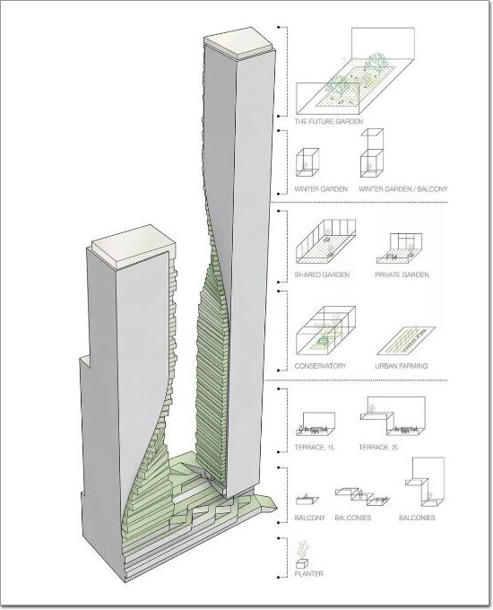 這個項目的兩座摩天大樓的頂部,將被一個公眾可訪問的植物園所覆蓋,由于兩座塔樓相向扭曲,綠色植物將面對面生長。