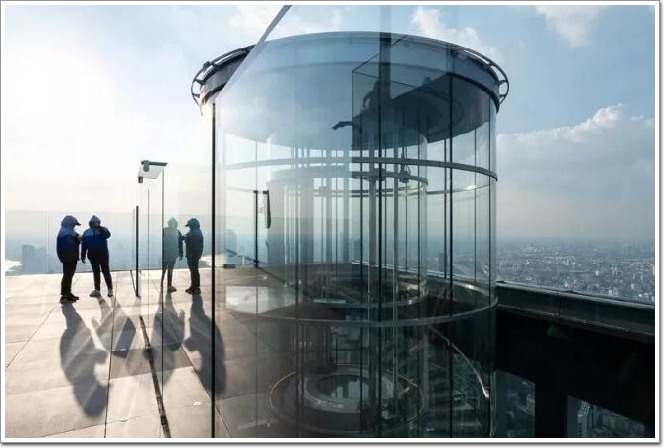 在大廈的頂層,一個巨大的玻璃觀景平臺橫空出世,漂浮在城市上空300米處,這個寬4.5米,長17.5米的,可步行玻璃觀景平臺,被稱為“天臺(Skytray)”,給訪客帶來全球最驚險,最身臨其境的眩暈體驗,并將成為曼谷最令人興奮的旅游目的地。
