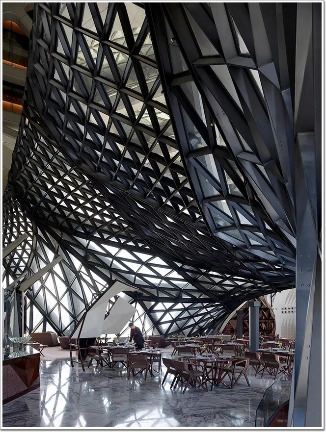 建筑師認為,這座高層建筑有著“世界首例自由形態”,其網格狀幾何形態讓建筑內部,不需要設立多余的承重墻或支柱,因為這會影響到酒店內部功能。