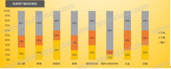 在數據采集統計結果中顯示的,鋁型材有超過一半的企業認為是上升的;建筑密封膠和隔熱密封材料(詞條“密封材料”由行業大百科提供)類企業,也有80%以上認為產值持平;幕墻以及玻璃等行業總體的生產值預期呈現下降。從圖表的數據情況可以分析出,國家宏觀政策面,包括化解產能過剩,去庫存等供給側改革背景下,對各細分產業帶來的影響。