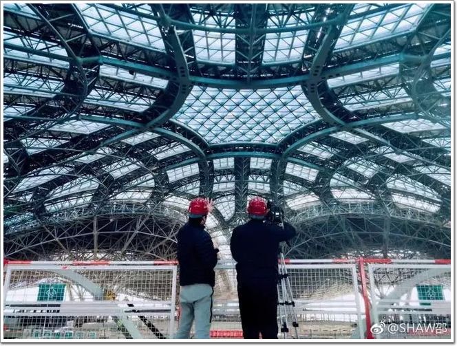 去年6月30日,整個鋼結構網構建完成,與鳥巢外殼的重量相當。整個曲面造型用時3個月時間完成。這個鳳凰造型的屋面鋼網架,總共用了6萬多根鋼架,1萬多個連接球,都是焊起來的。