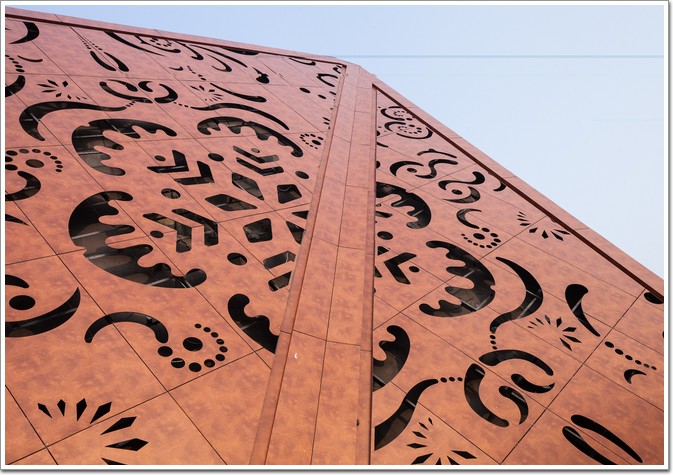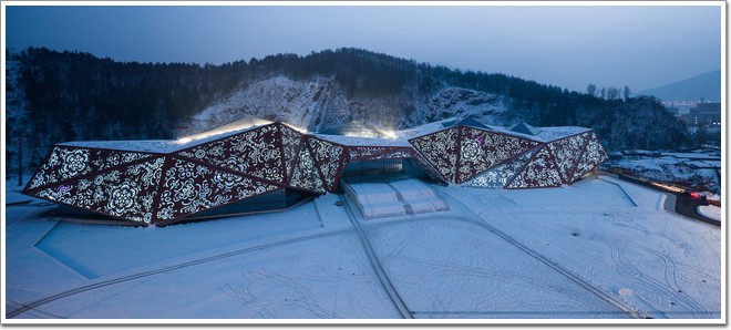 此外,“人與空間”的互動是設(shè)計(jì)的另一重點(diǎn),這是一種充滿視覺激情的互動美。多折面的建筑完整而富于力度,實(shí)體、虛體穿插的晶體造型又宛如剛被開采出的璞玉。以通化當(dāng)?shù)氐臐M族特色剪紙為主題的鏤刻金屬外立面以一種文化通感的方式、用迷幻的光影震撼地感染每一個來訪者。