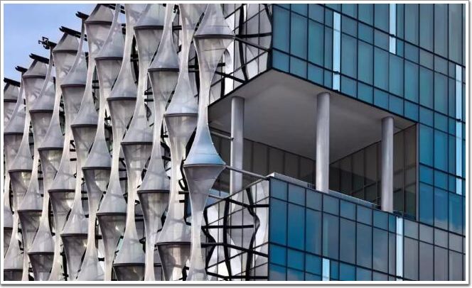 建筑是一個覆蓋著薄膜太陽能電池的高聳玻璃立方體。歸功于敷設在外立面的船帆樣輕質濾光材料,這座玻璃大樓不像一般同類建筑那樣棱角分明,反而給人一種“大枕頭”般的柔軟感。