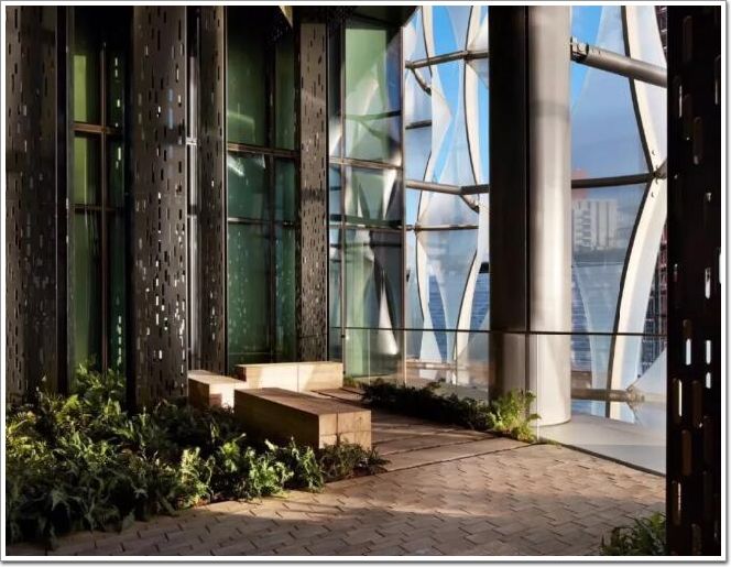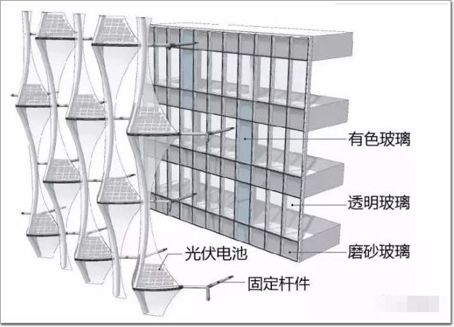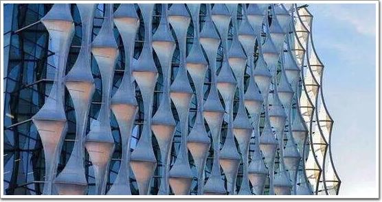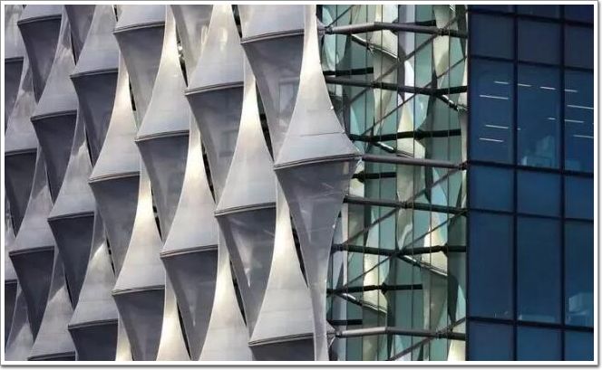 這種多層復合膜結構還能夠有效阻擋過剩的太陽輻射以及防止炫光,使建筑內部能夠得到均勻、舒適的日光,更因其似鱗片一般的機理形成一個粗糙的表面,減緩空氣下沉速度,以達到建筑底部風環境舒適的目的。