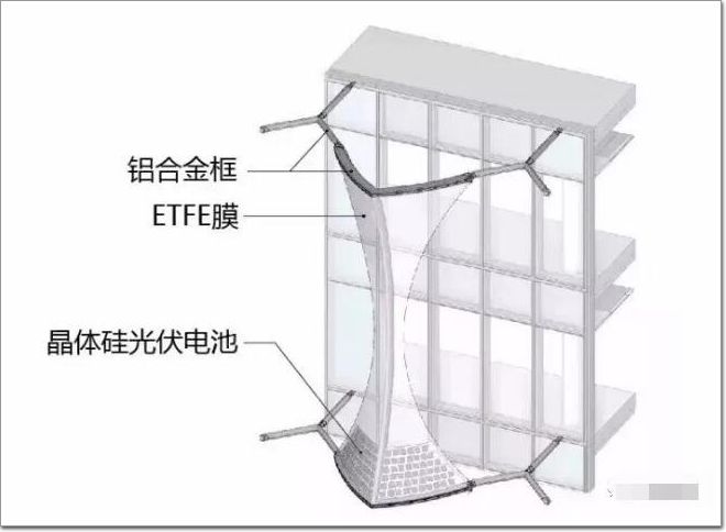 外面那層是十字型ETFE膜結構。在膜結構上嵌入柔性晶體硅(詞條“晶體硅”由行業大百科提供)光伏電池(詞條“光伏電池”由行業大百科提供),將太陽輻射轉化為電能,即便是在霧氣朦朧的倫敦也依然能夠為整棟建筑提供充足的能源,還能防止眩光,獲得均勻光照。