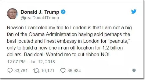 近日,特朗普證實將取消下月對英國的訪問,本來他計劃要為倫敦的美國大使館新址揭幕,11日他發推文責怪奧巴馬把原來的位置優越的美國駐英大使館“賤賣”,再花費10億美元建造新的大使館是一筆糟糕的買賣,所以自己才不去為新使館揭幕。