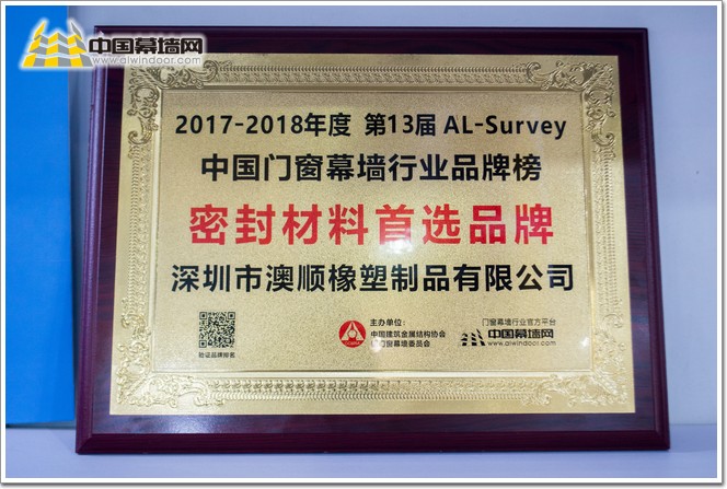 “澳順橡塑”憑借其豐富的生產經驗和技術,最終贏得廣大終端客戶、行業專家、設計院、顧問公司和媒體總編的高度認可,在第13屆AL-Survey2017-2018中國門窗幕墻行業大型讀者調查暨“我最喜愛品牌”評選活動中,成功衛冕“密封材料首選品牌”大獎!