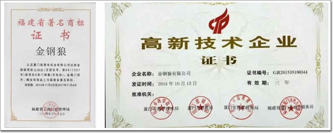 公司全面導(dǎo)入ISO9001:2008質(zhì)量管理體系認(rèn)證、ISO14001:2004環(huán)境管理體系認(rèn)證、OHSAS18001:1999職業(yè)健康與安全認(rèn)證,并先后被評(píng)為“國(guó)家高新技術(shù)企業(yè)”“廈門市守合同重信用企業(yè)”“廈門市質(zhì)量放心企業(yè)”“廈門市誠(chéng)信示范單位”,其“金鋼狼®”品牌先后榮獲“福建省著名商標(biāo)”、“福建省建設(shè)科技成果推廣項(xiàng)目”、“廈門市著名商標(biāo)”等榮譽(yù)稱號(hào)。在經(jīng)濟(jì)全球化中,公司始終堅(jiān)持產(chǎn)品技術(shù)革新及品牌創(chuàng)新的理念,內(nèi)促團(tuán)結(jié)協(xié)作,外求互惠共贏,竭誠(chéng)與海內(nèi)外合作伙伴深化合作,共謀發(fā)展!