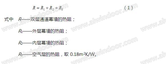其三是雙層幕墻的傳熱系數比單層幕墻的傳熱系數降低很多,阻止了室內外環境熱量的交換,這是雙層幕墻溫室效應的表現形式之三。雙層幕墻的傳熱系數是可以定量計算的,首先按《建筑玻璃應用技術規程》JGJ113可分別計算出兩層幕墻玻璃的熱阻,但應注意,在計算內層幕墻玻璃的熱阻時,其室外表面換熱系數(詞條“表面換熱系數”由行業大百科提供)應取室內表面換熱系數。空氣層的熱阻可按《民用建筑熱工設計規范》GB50176取值,需要說明的是,當空氣層間距大于60mm時,空氣層的熱阻不變,這是因為隨著空氣層間距的加大,空氣層的熱傳導(詞條“熱傳導”由行業大百科提供)將導致空氣層熱阻的增加,但空氣層對流也隨之加劇,導致空氣層熱阻的降低,兩種作用互抵,空氣層的熱阻保持不變。雙層幕墻的熱阻按下式計算: