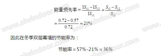 這里的節能率僅考慮了環境溫差和空氣滲透的影響。還要考慮太陽輻射的作用。在夏季,雙層幕墻的遮陽系數比單層幕墻的遮陽系數小,降低了夏季環境制冷的能耗,也就是說在夏季,雙層幕墻的節能率大于57%。在冬季,設陽光的輻射強度為Ⅰ,單層幕墻的遮陽系數Sc1=0.72,雙層幕墻的遮陽系數Sc2=0.57。由于雙層幕墻減少陽光進入室內,增加了室內的采暖負荷。增加的能量損失率為: