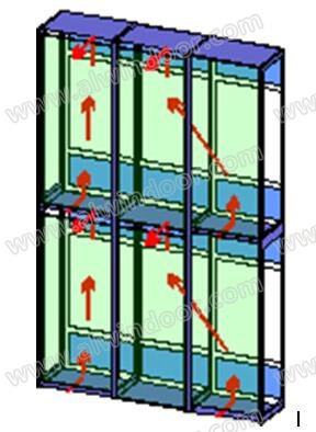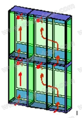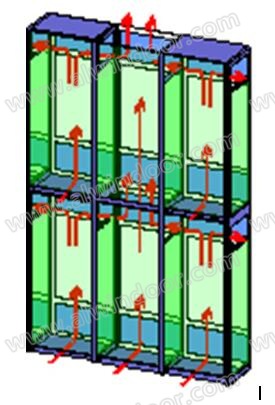 雙層幕墻最大的優點就表現在熱工性能上,分歧最大的也在熱工性能上。雙層幕墻有明顯的溫室效應,顧名思義,溫室效應即是雙層幕墻通道能形成熱屏蔽,冬季能阻止室內的熱量流向室外,夏季能阻止室外的熱量流向室內,使得室內處于較恒定的熱環境中。雙層幕墻的溫室效應共有三種表現形式:其一是在炎熱的夏季,雙層幕墻中通道里的進氣口和出氣口全部打開,由于煙窗效應,空氣將在通道中自下而上的運行,在空氣運行過程中,將通道內的熱量帶出通道,使得內層幕墻處于較低的溫度環境中,阻止了熱量由室外流向室內,這是雙層通道幕墻溫室效應的表現形式之一,見圖7。但是這種溫室效應是動態的、隨機的,只能定性描述,目前還無法定量計算,即使采用計算軟件模擬計算,其結果的準確性也不好評價。