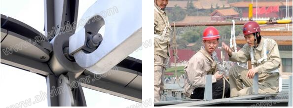 為此,國家大劇院的穹頂屋面系統(tǒng),在國內(nèi)首次引進了“鋁鎂錳直立鎖邊金屬屋面”系統(tǒng)。其最大的特點是,外層裝飾板的支承結(jié)構(gòu)不是穿透屋面固定在主體結(jié)構(gòu)上,而是用連接夾具直接連接固定在鋁鎂錳板的立邊上。實現(xiàn)了無穿透式連接,很好的實現(xiàn)了屋面系統(tǒng)的各項物理性能,特別是對防止屋面漏水起到了決定性的作用。(如圖2.1.3~2.1.4)