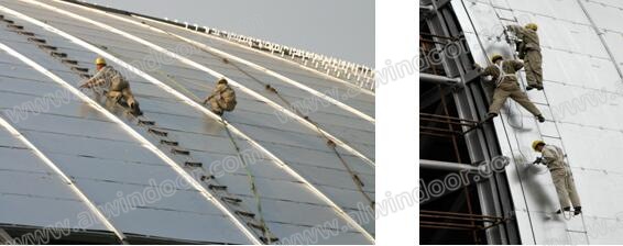 大劇院外裝飾面的清洗方案,在初期設(shè)計時是采用機器人自動清洗設(shè)備和清洗用噴淋系統(tǒng)對鈦金屬板的表面和玻璃采光頂?shù)谋砻孢M行清洗。由于各種原因自動清洗設(shè)備未曾安裝使用。頂部清洗用噴淋系統(tǒng)也未曾使用。屋面的清洗主要是采用蜘蛛人的人工清洗方案;